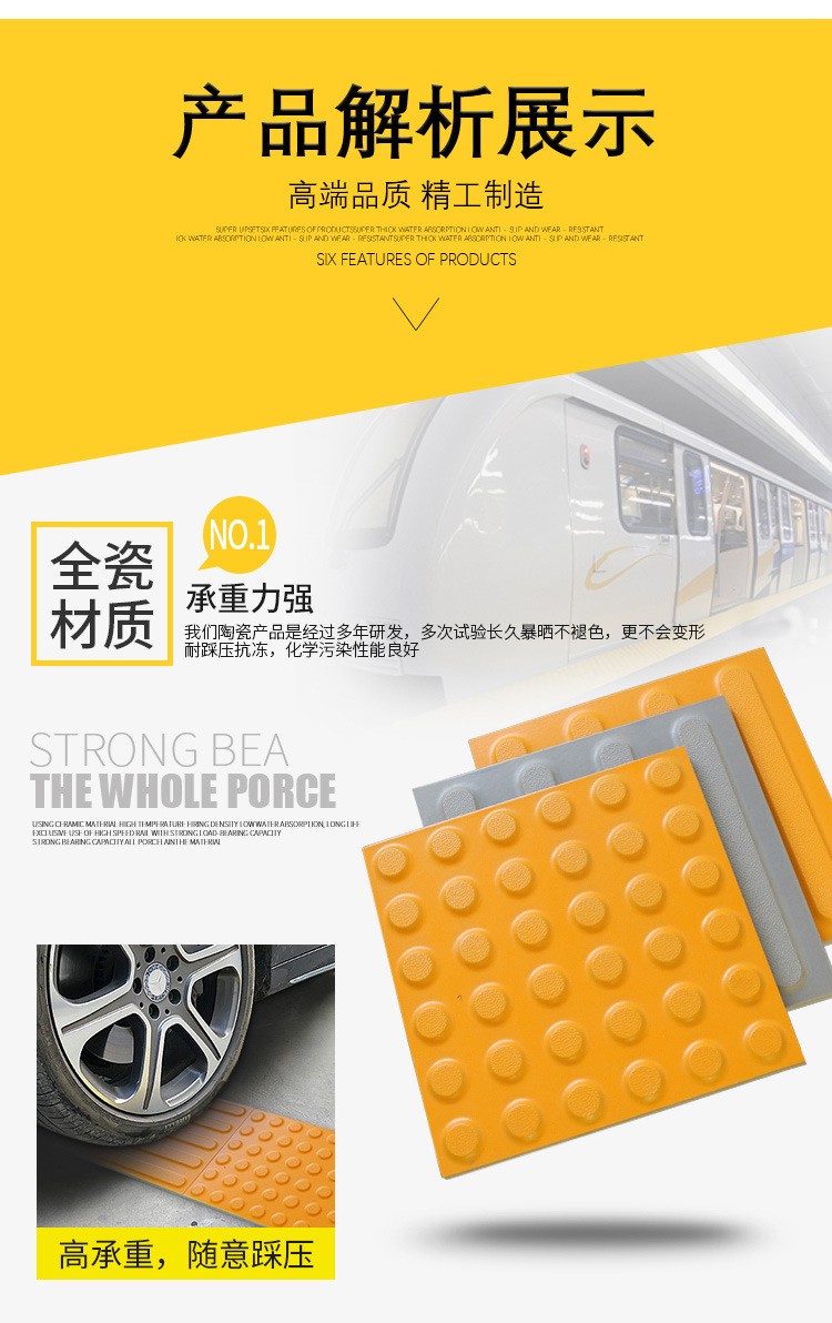 火車站站臺(tái)止步線國(guó)家標(biāo)準(zhǔn)寬度是600毫米寬,所以一般盲道磚規(guī)格都是600毫米的倍數(shù),比如有常用的300*300*20.300*300*25,以及400*400;300*400等。 這種盲道磚的成型方法是干粉制胚,壓制成型。